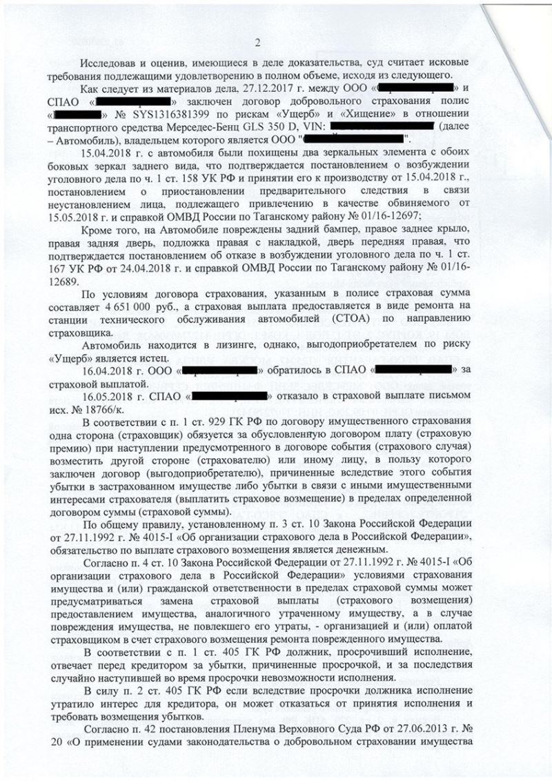 Клиент ООО «С...», не смотря на наличие договора КАСКО со страховой компанией, после наступления нестандартного страхового случая, получил отказ в страховом возмещении. Клиент не сразу обнаружил повреждения машины, а только наступления второго страхового случая (хищение передних фар), заметил также и другие повреждения, которые, возможно были совершены ранее.