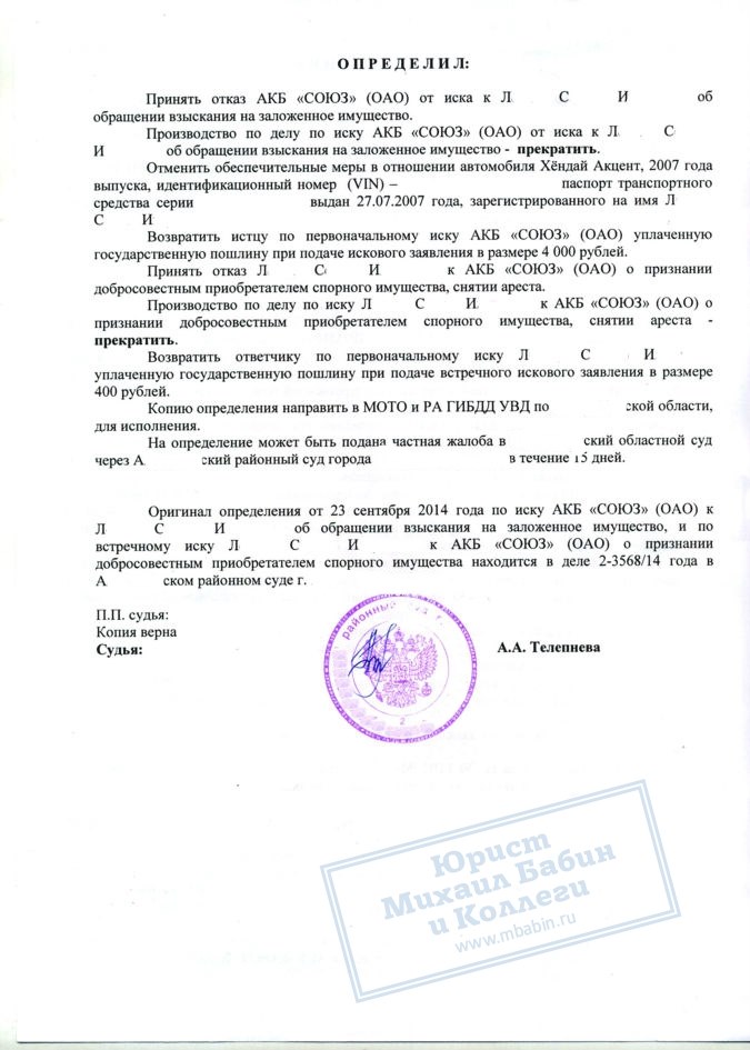 В результате активного содействия юриста конфликт был полностью улажен: иск о взыскании заложенного имущества отозван, арест с автомобиля снят и дело прекращено.