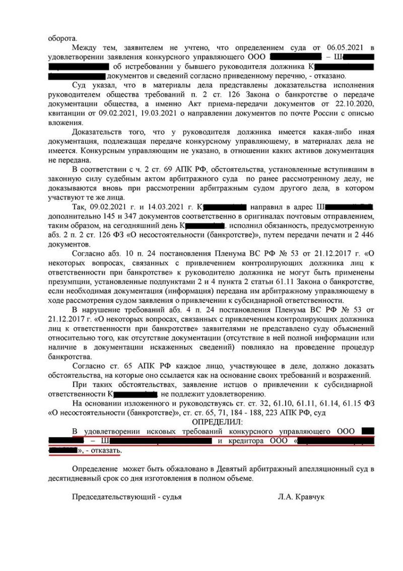 Адвокат проанализировал заявленные требования и доводы, на основании которых заявитель требовал привлечь клиента к субсидиарной ответственности и пришел к выводу о том, что в данном случае каких-либо доводов помимо не передачи арбитражному управляющему документов юридического лица при введении банкротства – не имеется. Была выполнена объемная работа, в результате которой арбитражному управляющему была передана печать, а также 2 446 документов в оригиналах по акту, достигнут положительный результат по делу об истребовании документов, по которому решение было вынесено в пользу клиента.