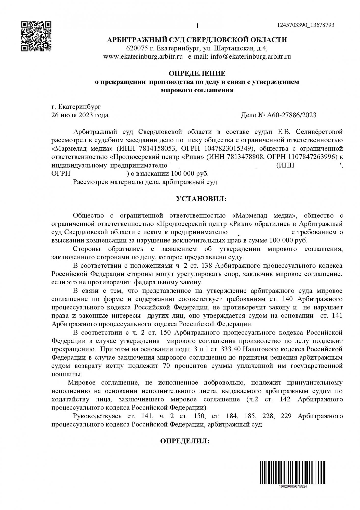 Истцы (ООО «Мармелад Медиа» и ООО «Продюсерский центр «Рики») обратились в Арбитражный суд Свердловской области с иском к ИП о взыскании 100 000 руб. компенсации за нарушение исключительных прав на товарные знаки и художественные произведения (рисунки) персонажей анимационного сериала «Малышарики»: «Крошик», «Нюшенька», «Барашик», «Пандочка». В ходе рассмотрения дела стороны заявили о заключении мирового соглашения и представили его текст на утверждение суда.