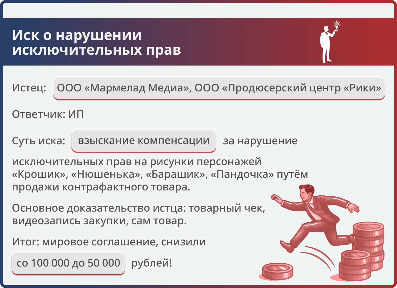 Два правообладателя («Мармелад Медиа» и «Рики») требовали компенсацию за нарушение прав на персонажей «Малышариков». Юристы компании инициировали переговоры и подготовили мировое соглашение, по которому компенсация снижена вдвое.