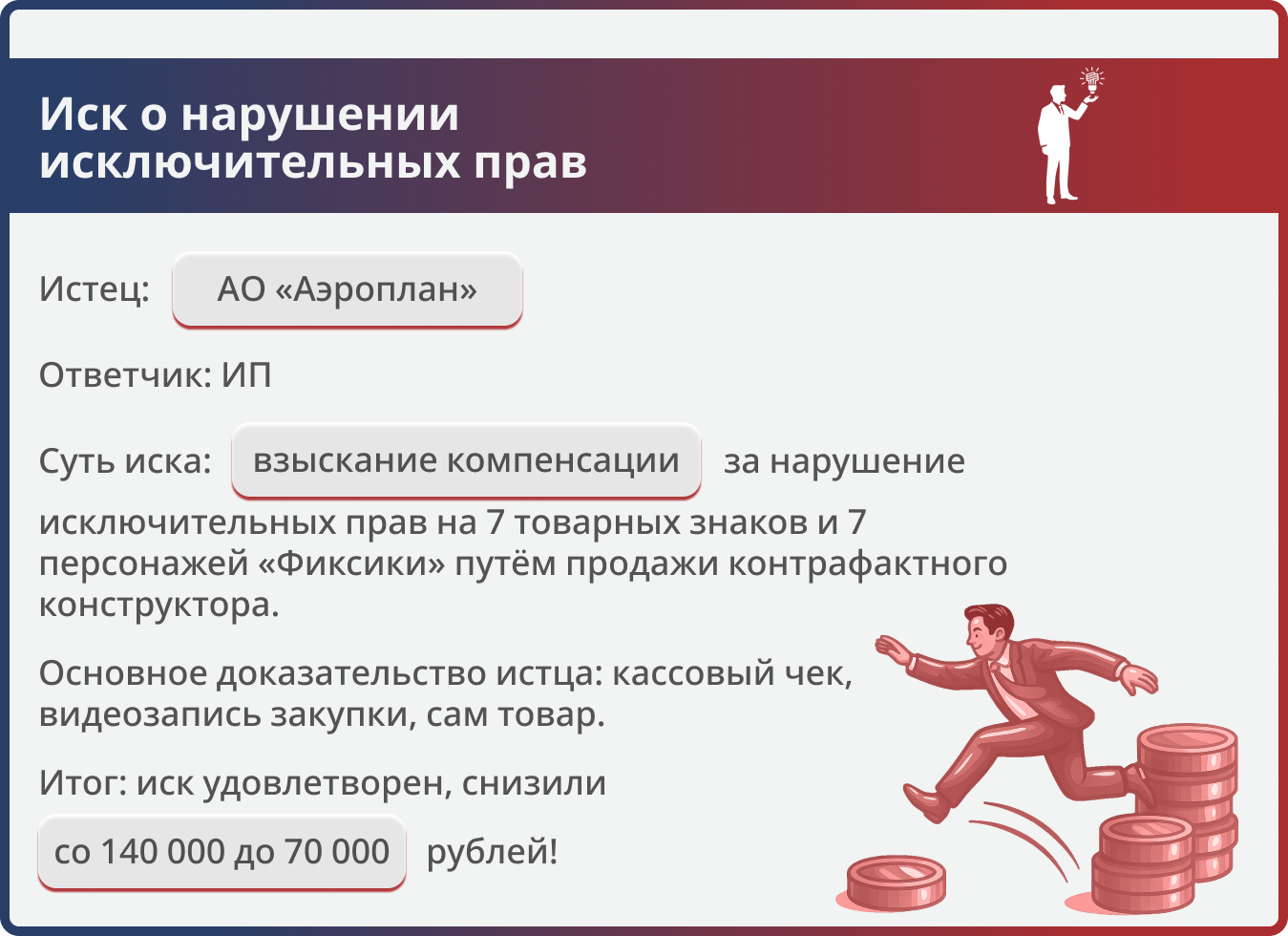 Истец требовал 140 000 руб. компенсации за продажу конструктора с изображениями персонажей «Фиксики» (14 объектов интеллектуальных прав). Наши юристы компании доказали возможность снижения на основании п. 3 ст. 1252 ГК РФ, и суд уменьшил выплату вдвое — до 70 000 руб.