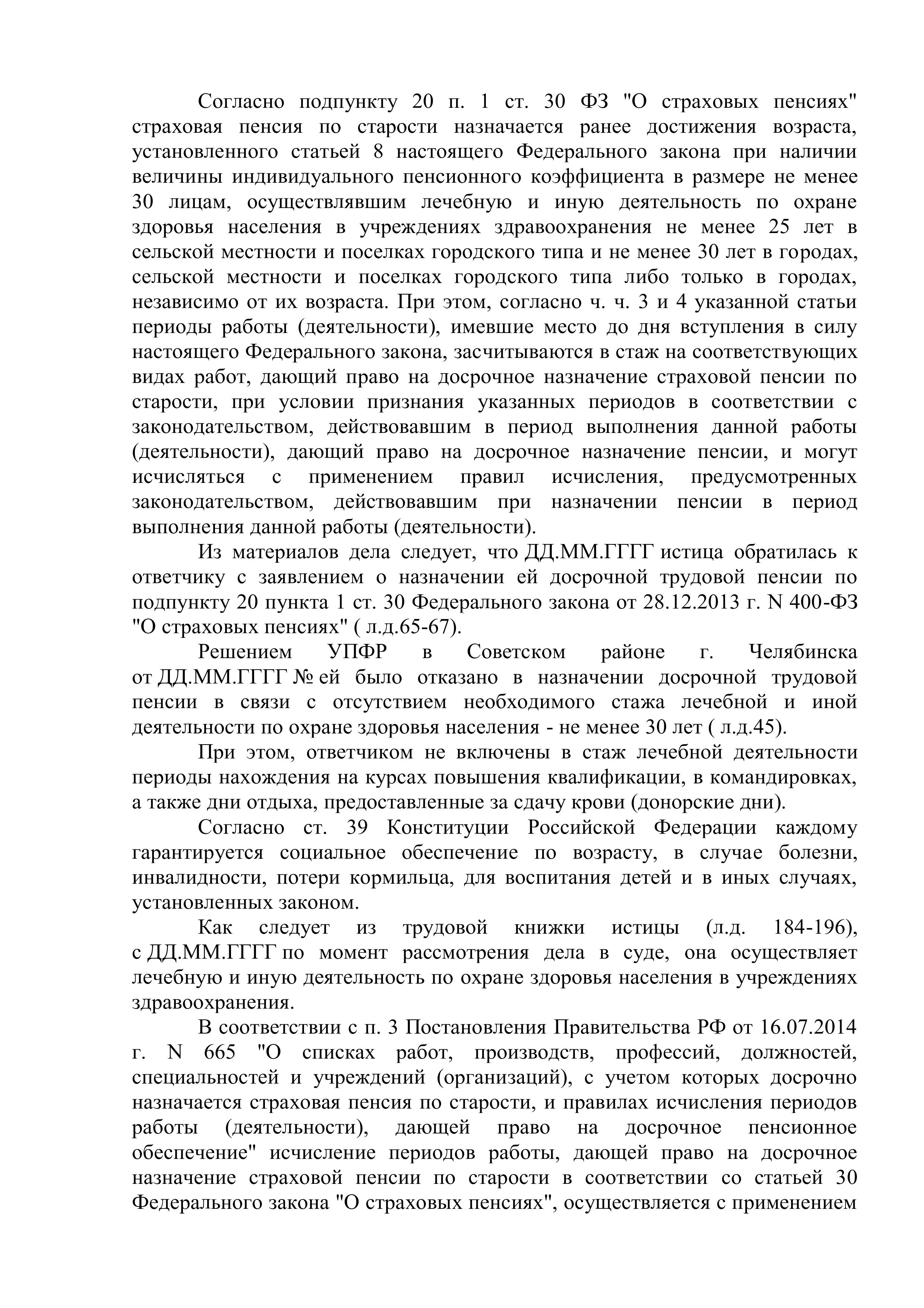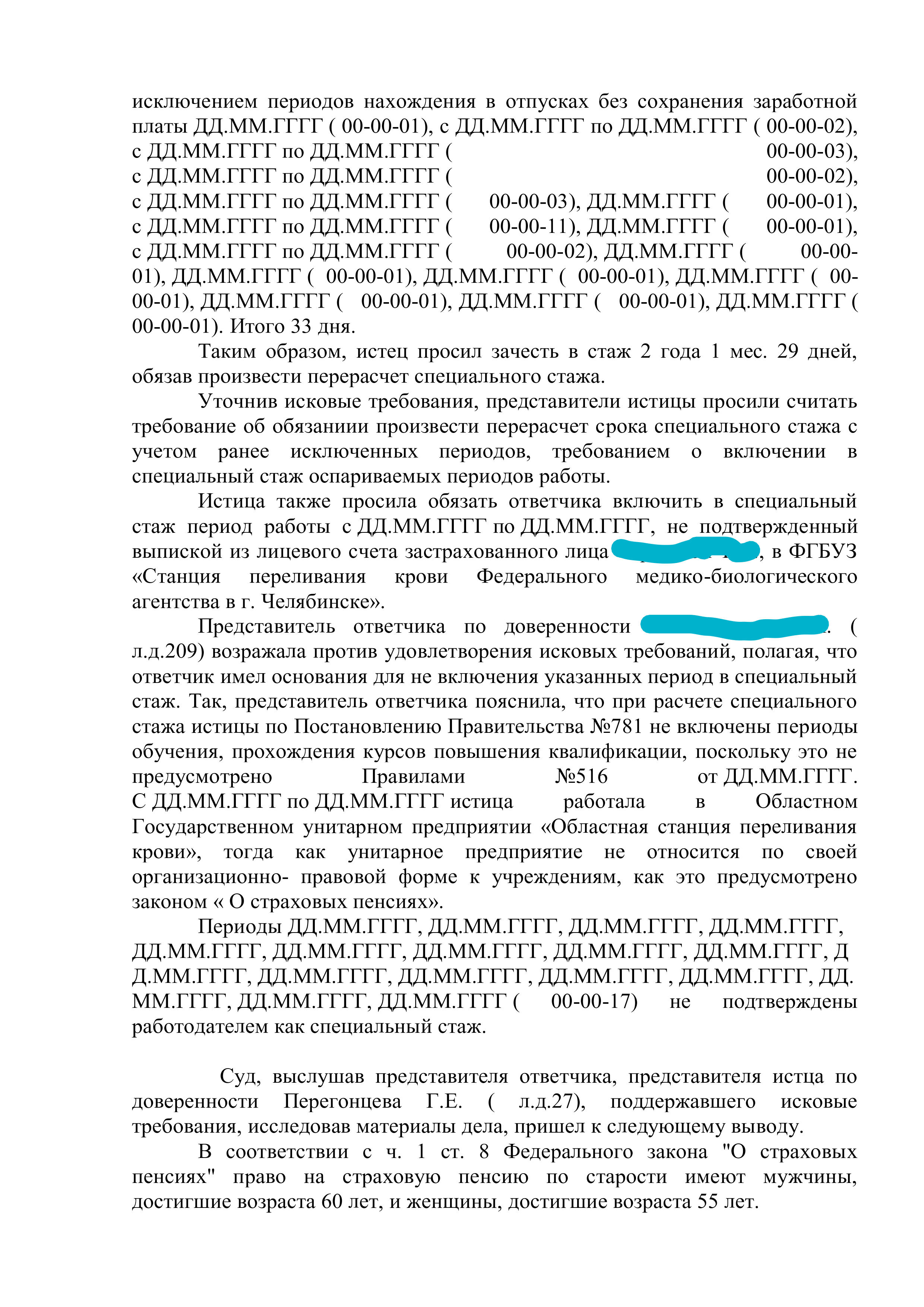Юрист "Оригинального решения" подготовил все необходимые документы, доказывающие суду то, что УПФР незаконно не включил в специальный стаж для назначения досрочной пенсии периоды работы, в сумме составляющие более 26 месяцев. Также, благодаря проделанной работе, удалось убедить суд включить в специальный стаж дни отдыха, после сдачи донорской крови.