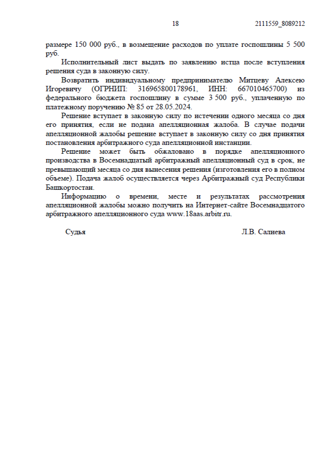 Арбитражный суд Республики Башкортостан полностью удовлетворил наши требования.