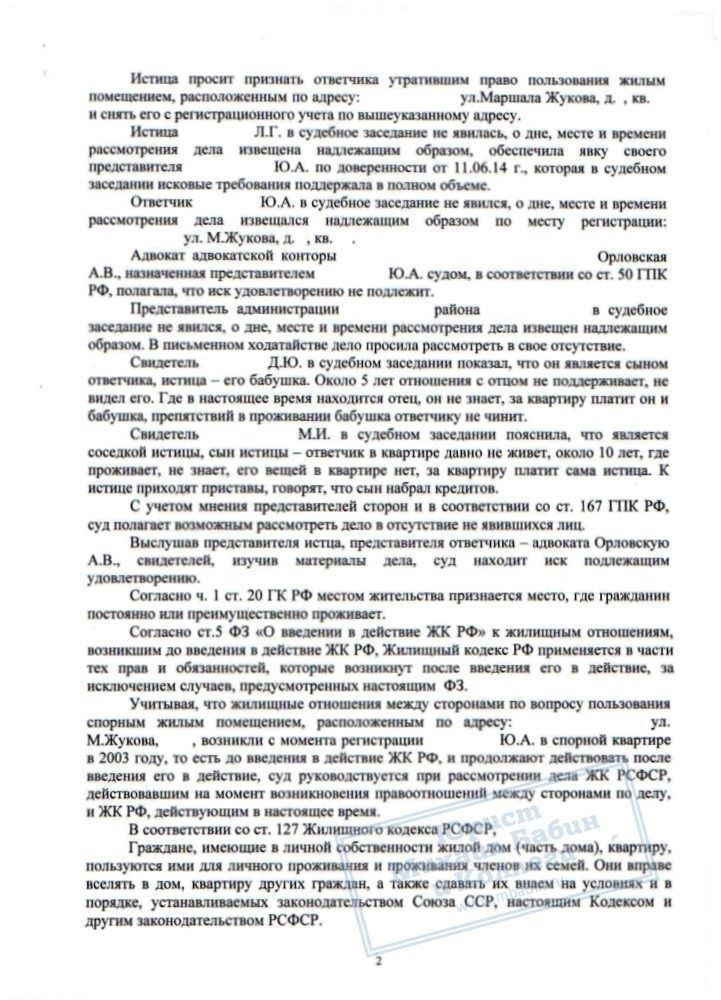 С помощью юриста нашей коллегии, нарушение закона было устранено, сын Б. признан прекратившим право пользования квартирой и выписан из нее.